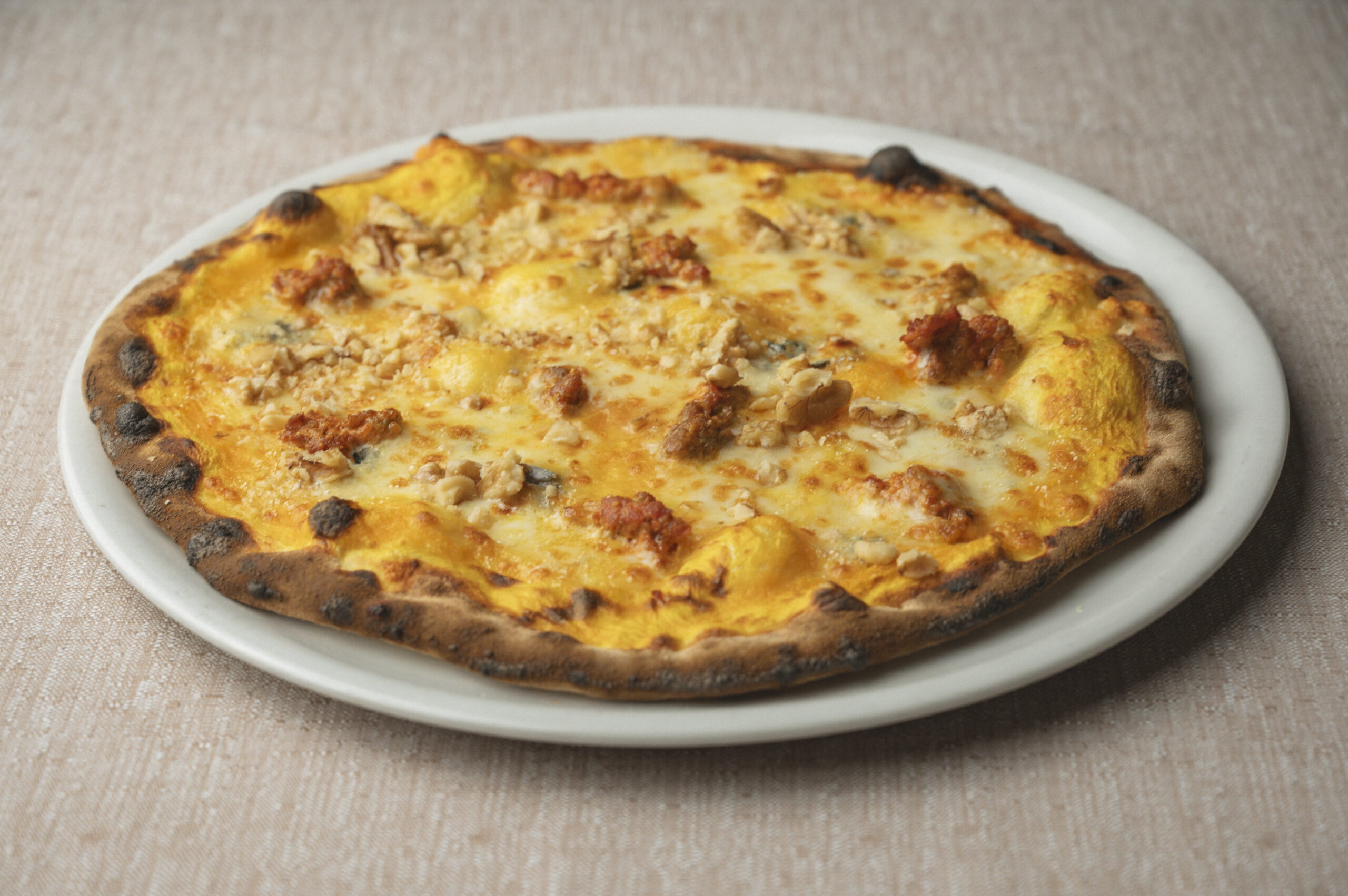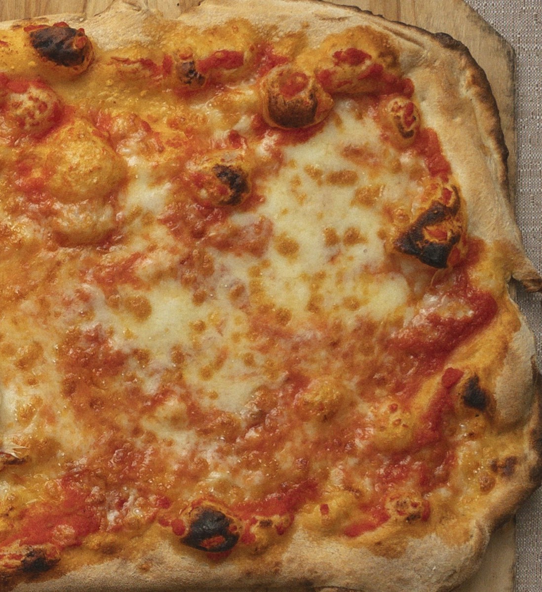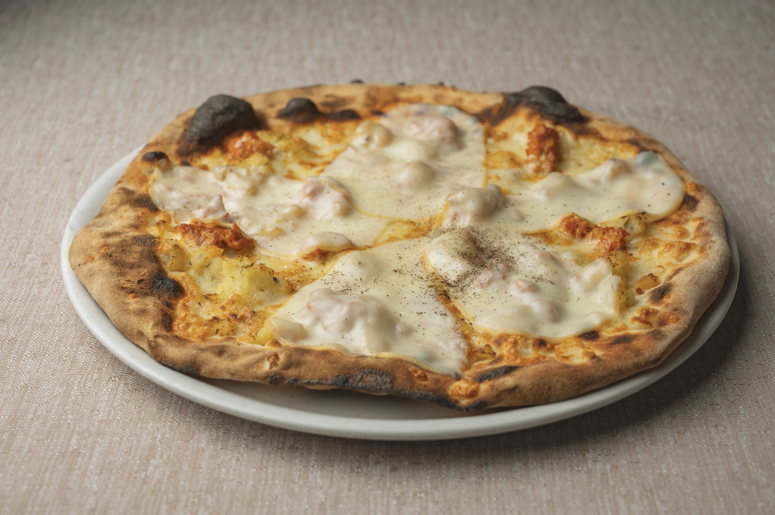 mozzarella, salsiccia, patata schiacciata, provola e pepe